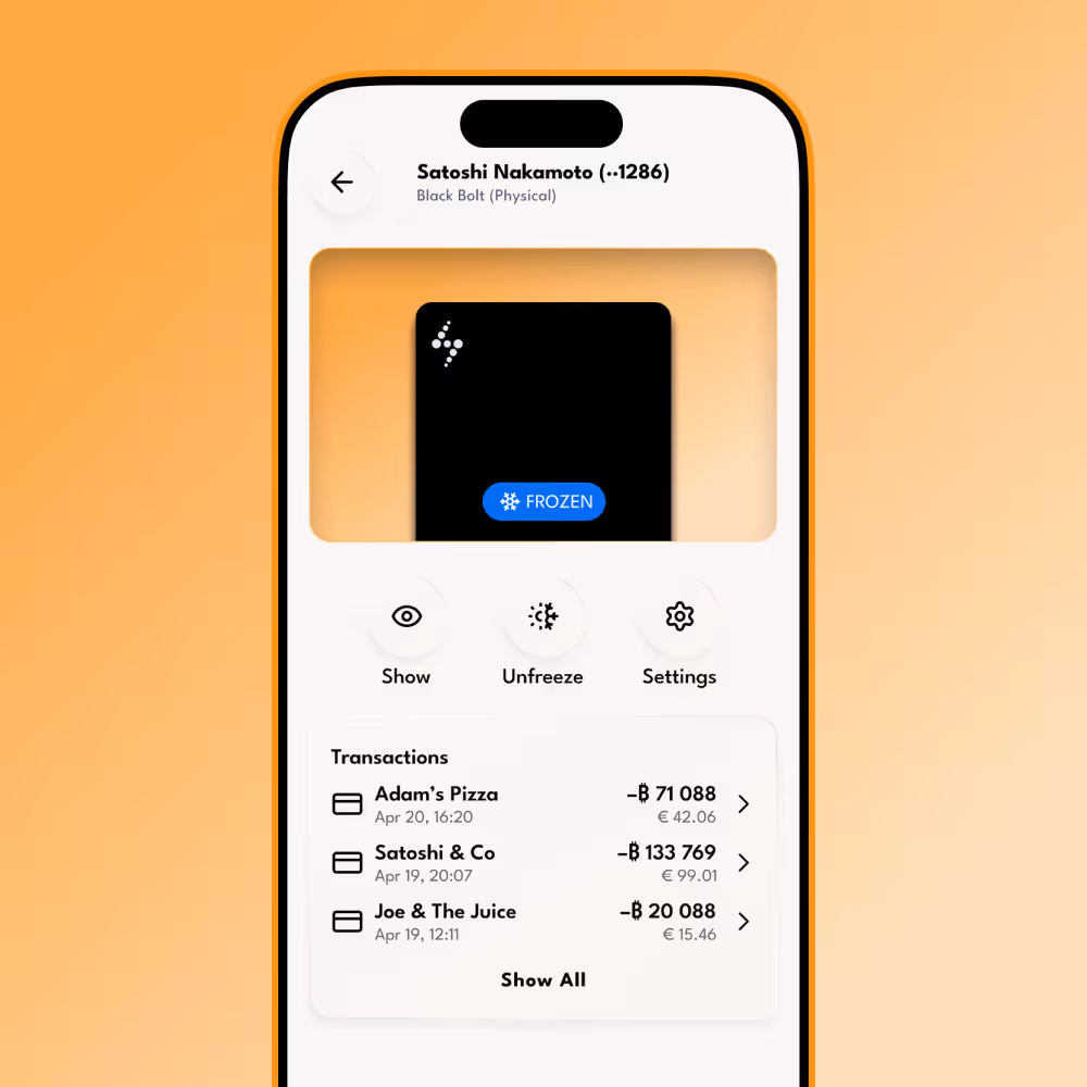 The first-ever VISA debit card that spends Bitcoin from your own Lightning wallet automatically.