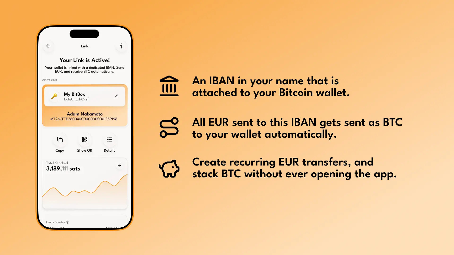 This is a big one! You can now give your wallet a dedicated IBAN! “Link” is a permanent bridge to a specific wallet, enabling you to automate buying BTC directly into self-custody.