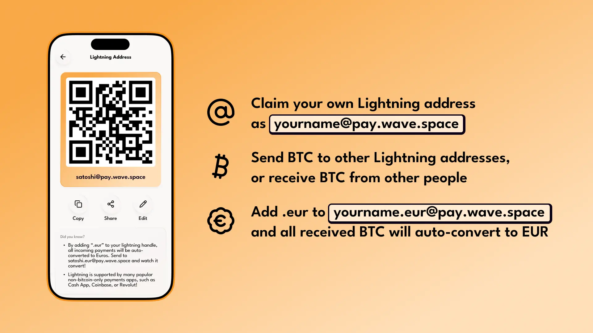 From now on, you can claim your very own address on wave.space completely for free and start receiving BTC payments instantly. Lightning withdrawals are also free of charge, contrary to many other apps, so we're embracing Lightning as much as possible, and we'd love for you to try using wave.space as your primary Bitcoin payments app.
