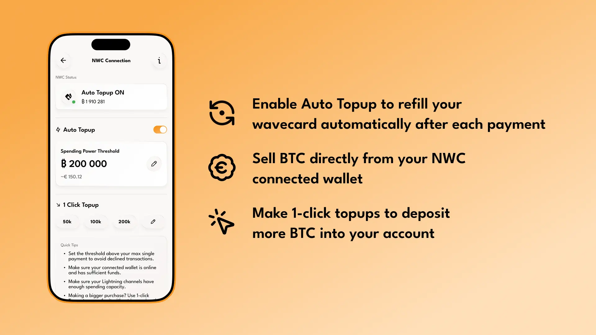Besides the auto-topups powering your self-custodial wavecard spending, we also added 1-click BTC topups, as well as the ability to sell BTC directly from your NWC connected wallet.