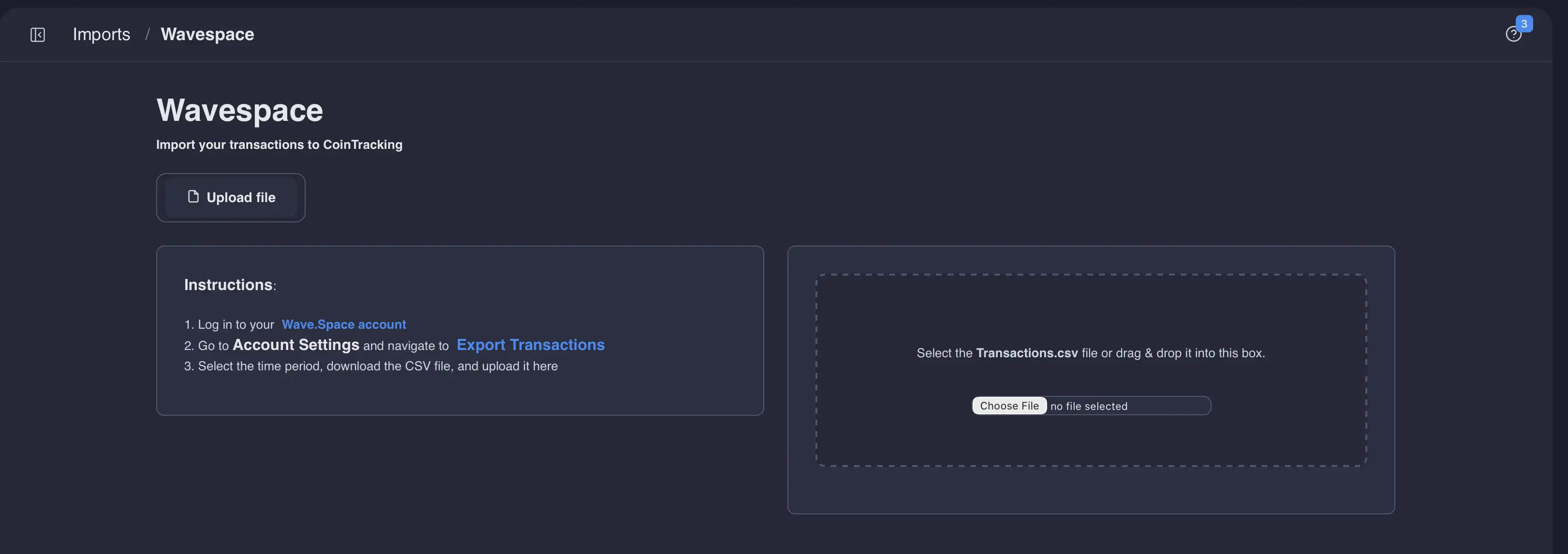 Navigate to "Imports" section on your CoinTracking account and choose Wavespace as an option. Then upload your newly generated CSV file as is. CoinTracking should automatically organize all transactions correctly. You don't need to manually map anything. Finally, click "Start Import"